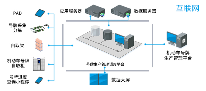 系统由号牌生产管理调度平台、数据大屏、PAD管理端、号牌进度查询小程序、号牌自取柜、号牌自取架等组件构成。