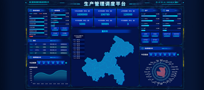 号牌生产管理调度平台数据大屏,采用图形化、实时化展示原材料数据、半成品数据、生产数据、投送数据、数据汇总信息。