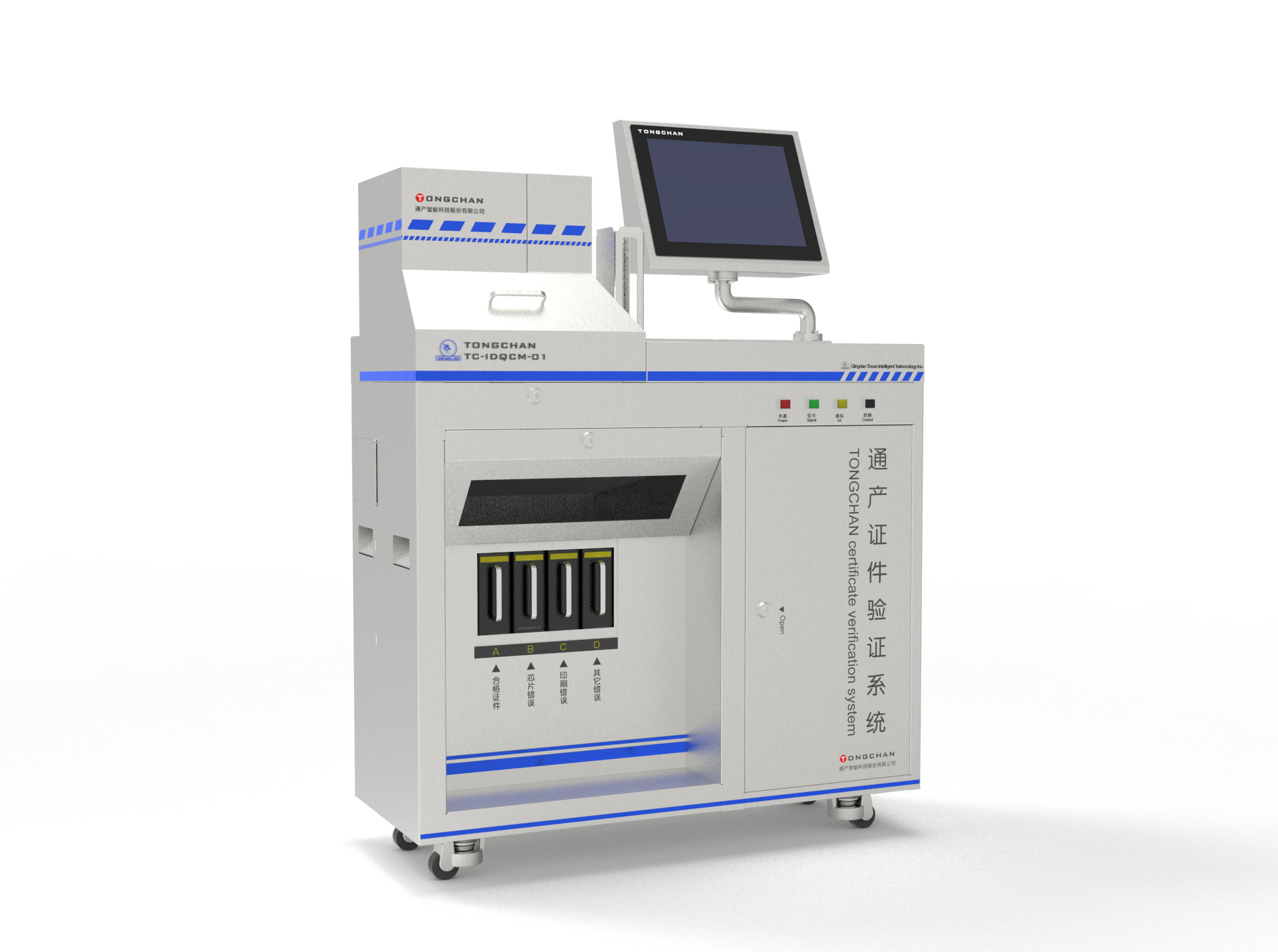 通产身份证质检机采用机器视觉加人工智能算法,能够高效准确地检测出身份证制证过程中的各种质量问题,如:污点、损坏、信息错误等情况;以提高身份证的制证速度和质量,解放劳动力。