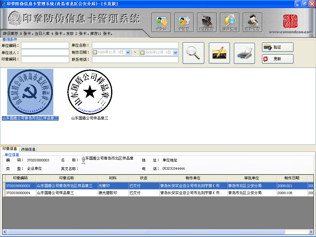 《通产印章防伪信息管理系统>是以印章信息防伪卡作为媒介,作用于防伪卡申请、制作、 发放、管理全过程的信息管理系统。 系统使用印章防伪信息卡专用阅读机具,阅读对比印模信息,能够准确地辨别印章的真伪
