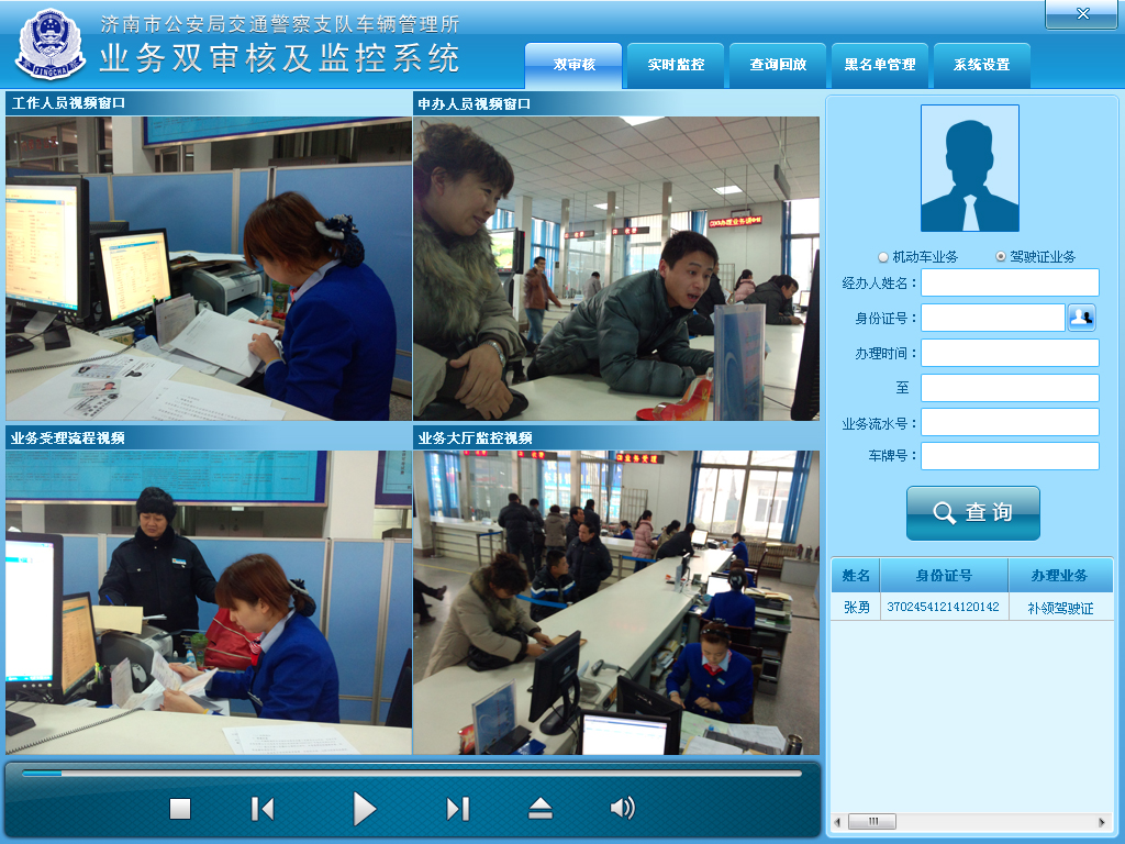 系统应用在车辆管理所服务大厅,主要功能是对业务办理过程通过音视频设备记录,进行业务监管及重点业务手续审核,防止违规操作,提高服务质量,保留窗口服务人员工作证据,减少业务纠纷。