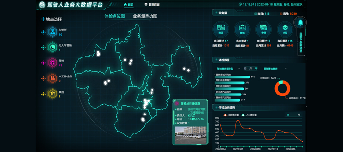 “驾驶人业务大数据平台”是协助交管部门管控驾驶人体检业务而建设的综合性监管平台。 平台实时监管各省、市、地区的驾驶人体检业务办理情况,对业务进行多维度的数据分析,对设备状态进行实时推送。