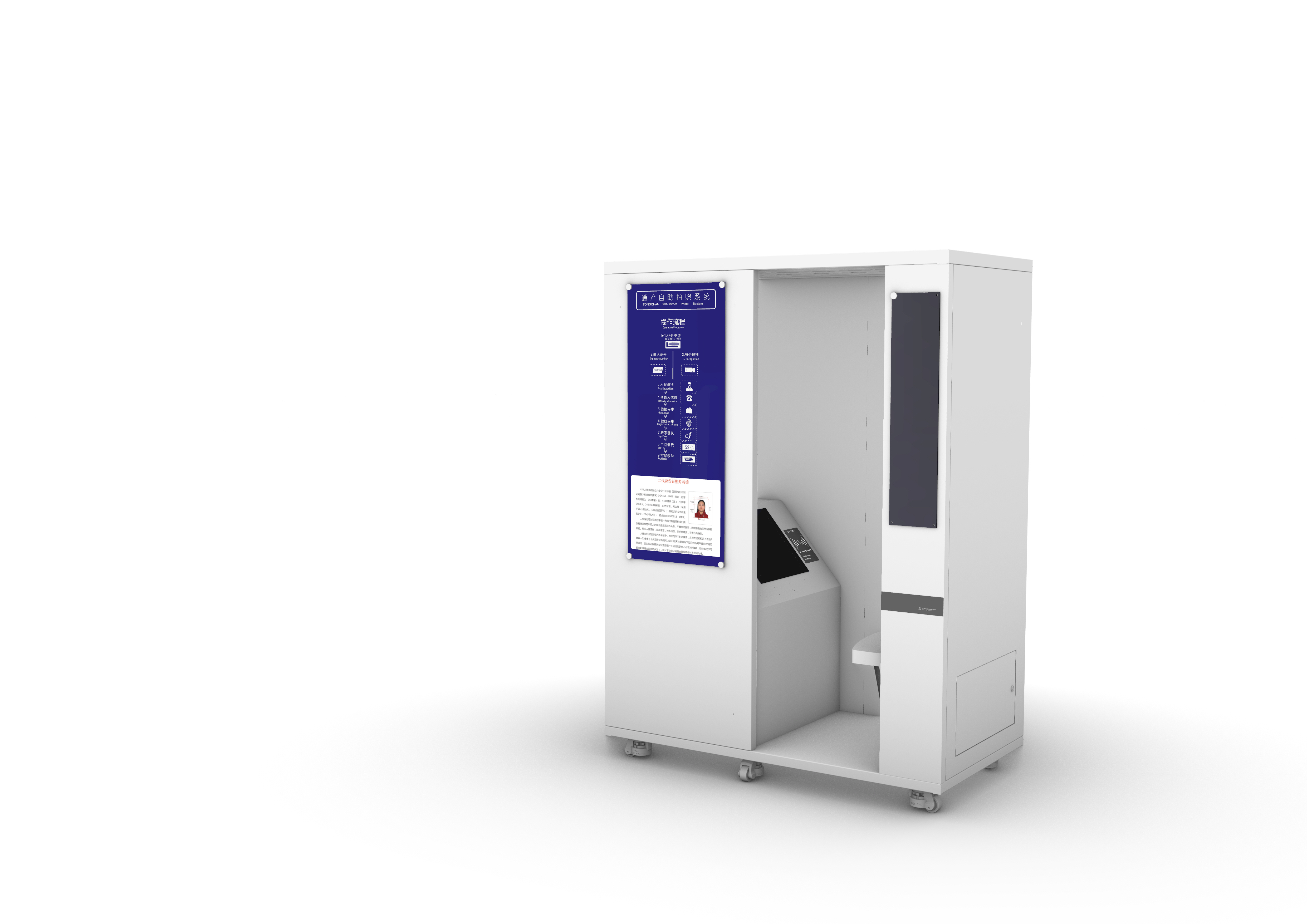 通产自助拍照设备机柜使用全钢机壳、结构坚固不易变形,整体美观、大方,能适适应多种工作环境,如:派出所、驾校、照相馆、便利店、写字楼、商场等群众照相采集电子身份信息及相片信息等办证场所。